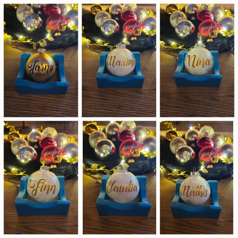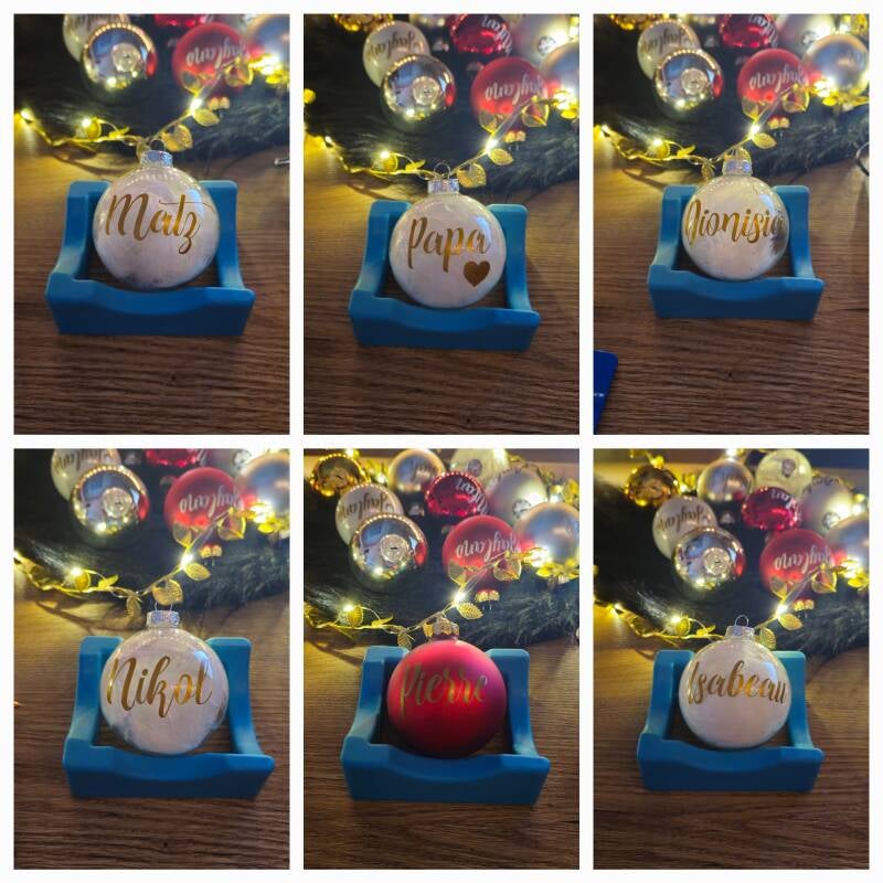 Doorzichtige kerstbal met witte veertjes.